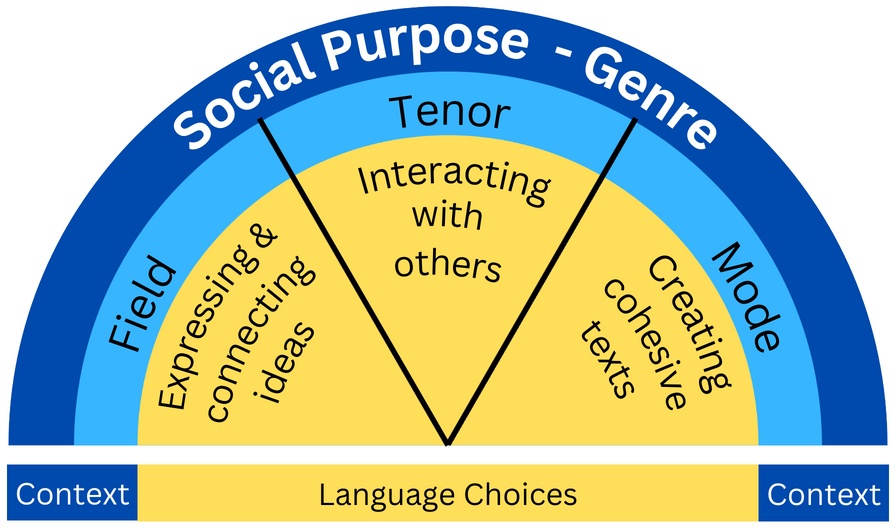 The overarching context is the social purpose. This informs the genre, or text type, of the interaction.